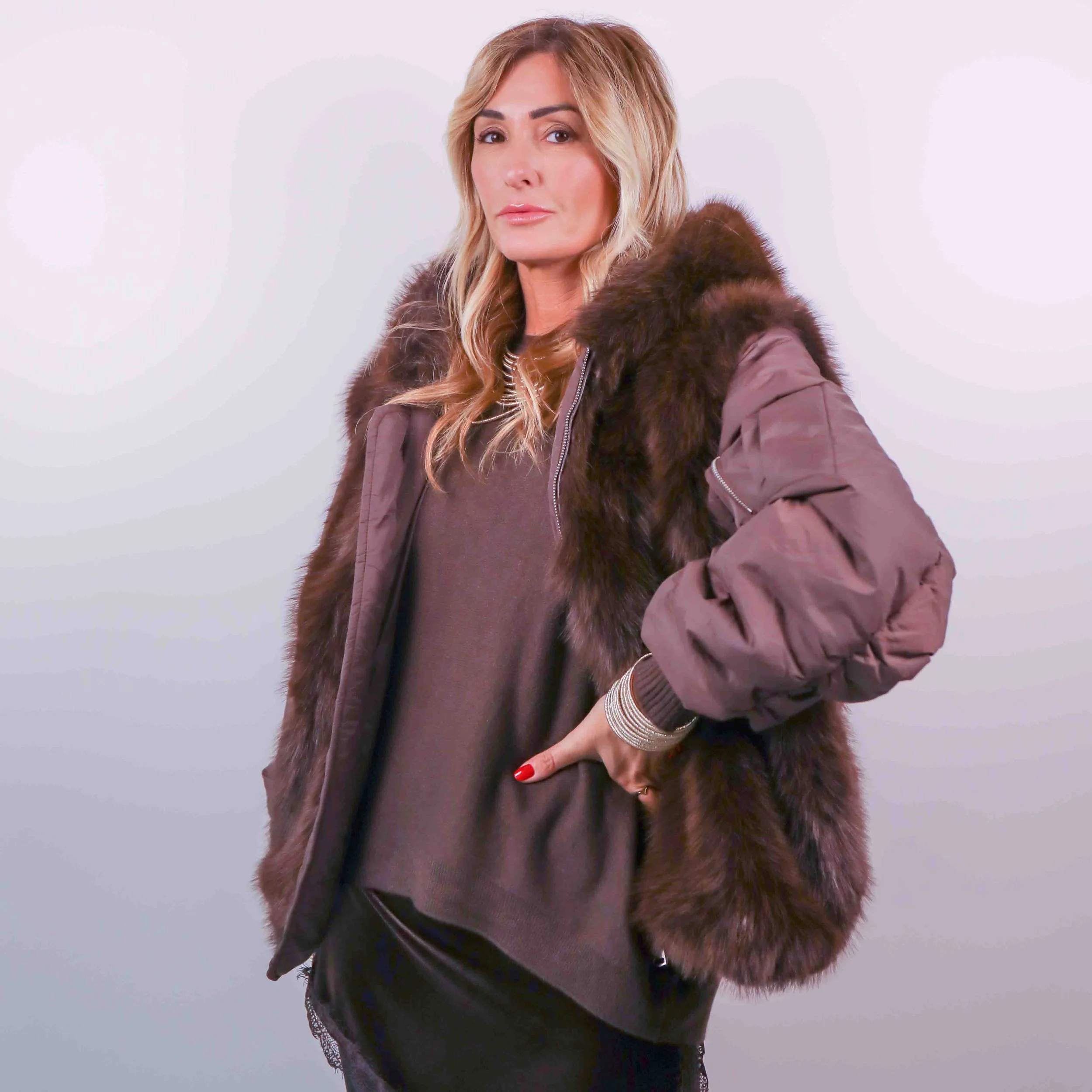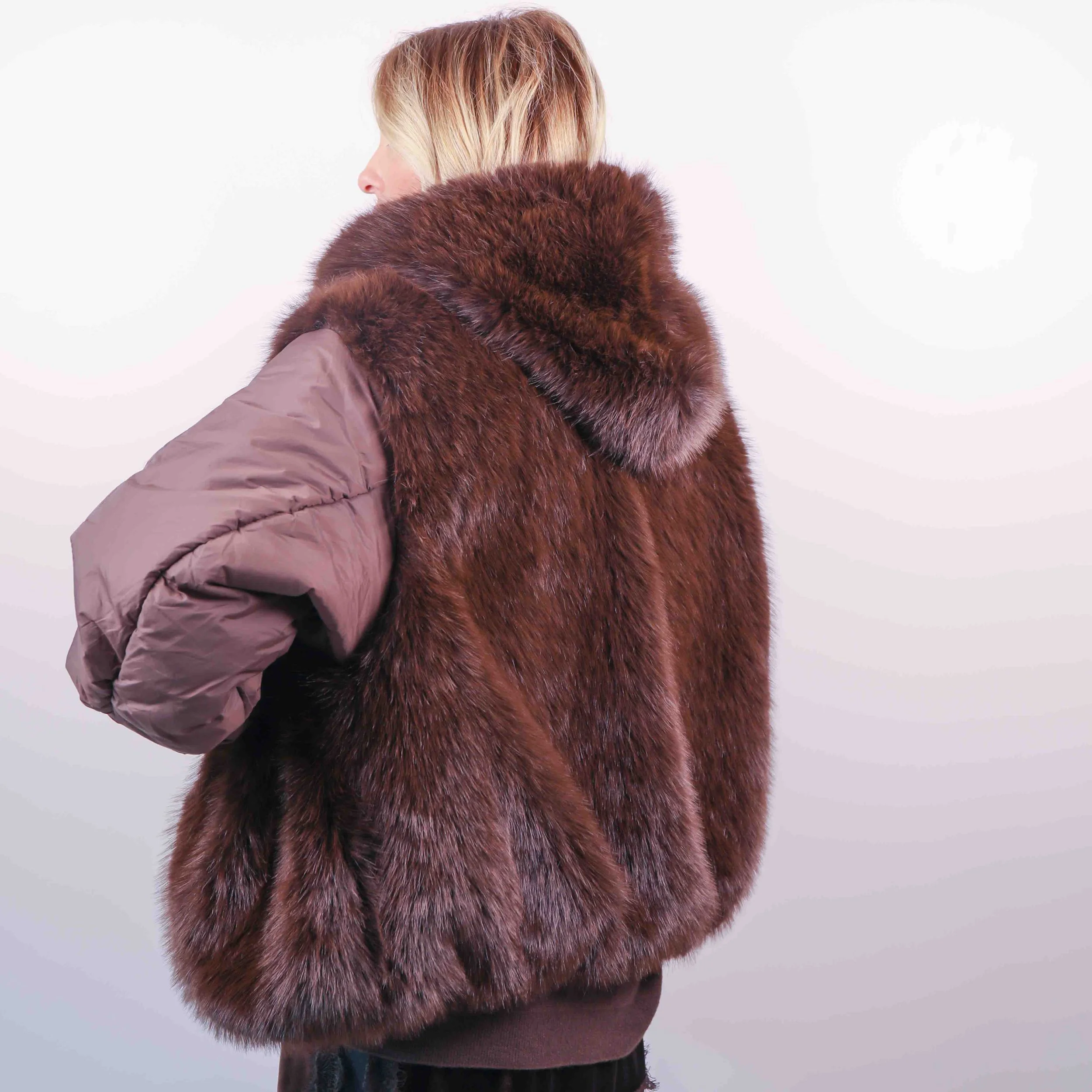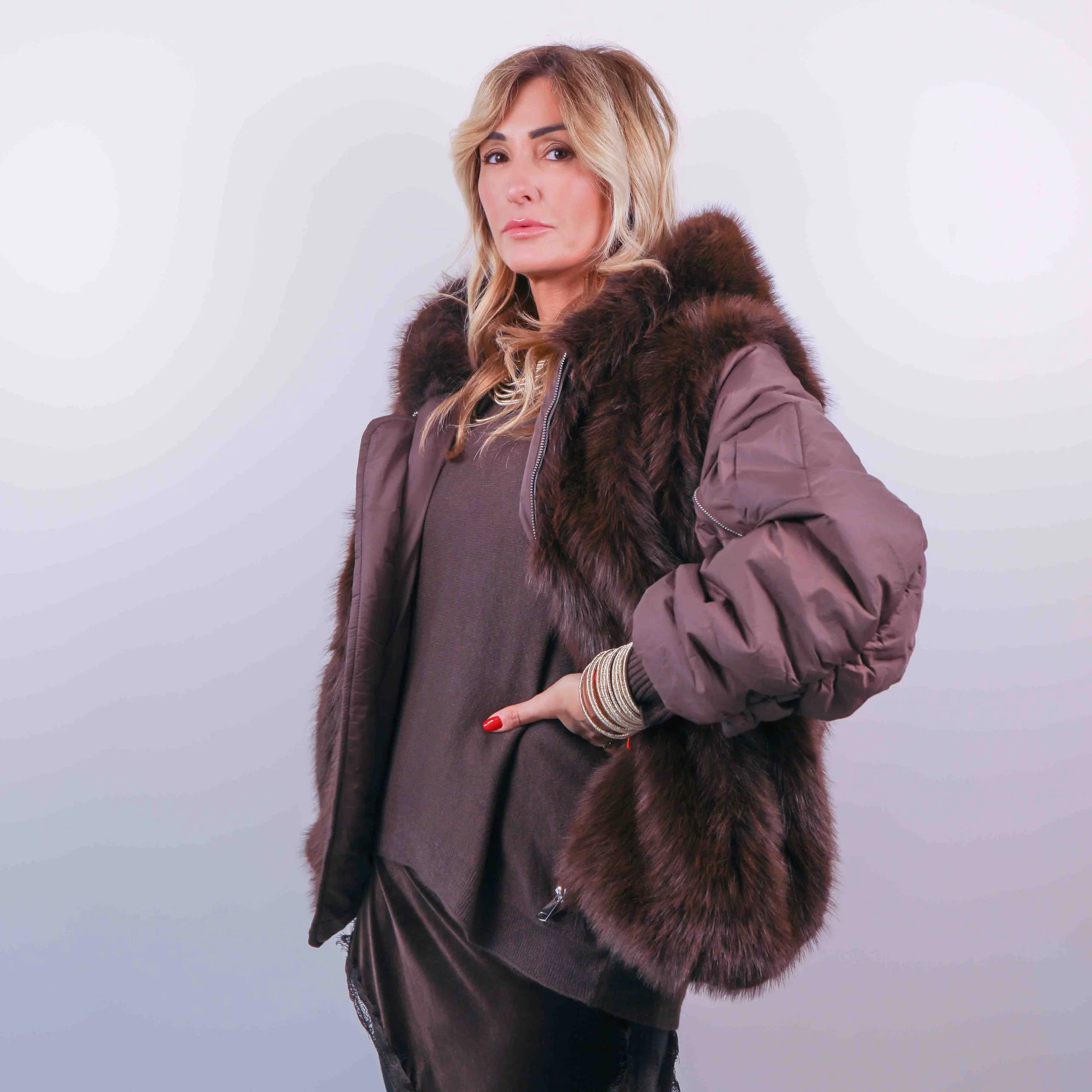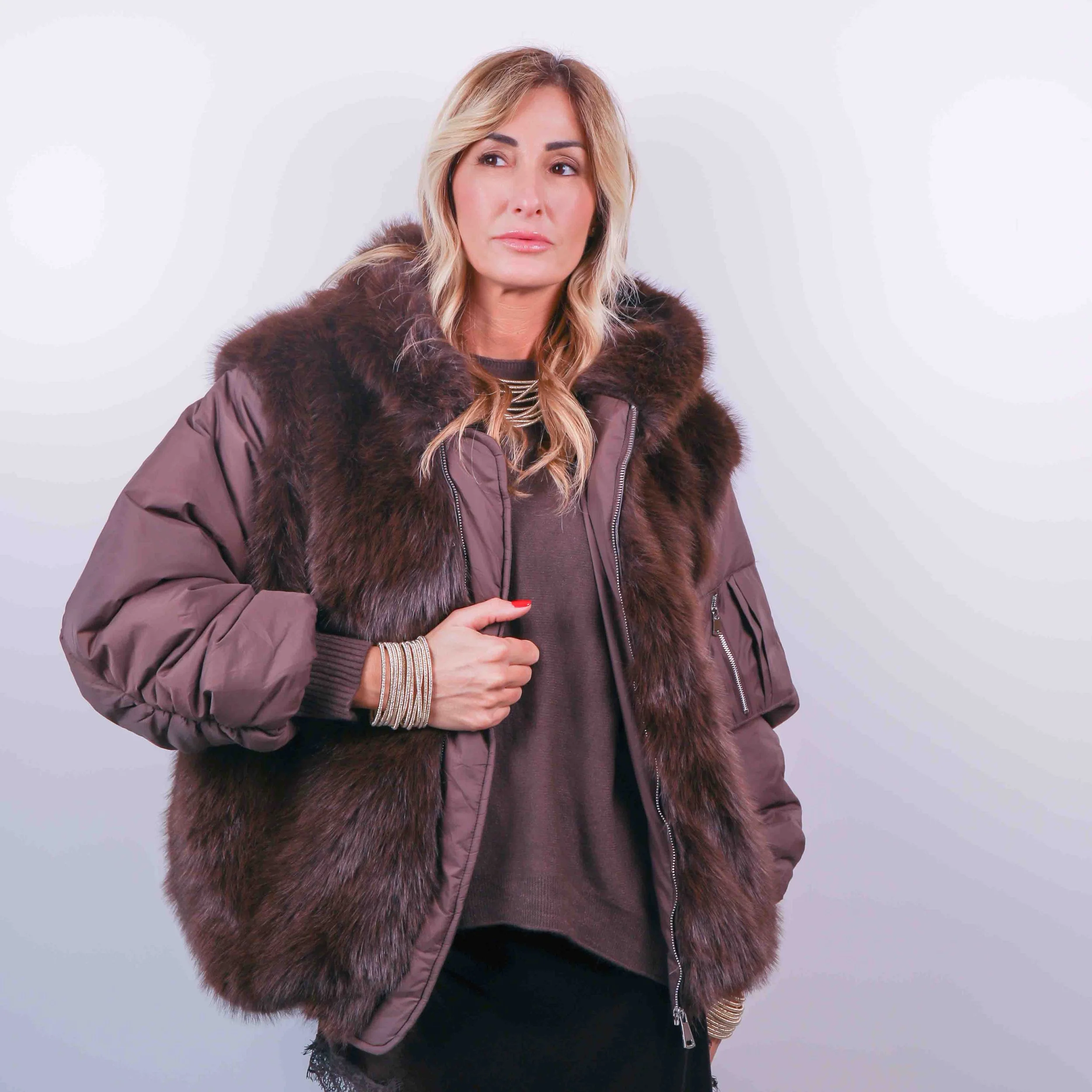 Giaccone in tessuto tecnico con ampi inserti in morbida eco-pelliccia tono su tono. Modello oversize con chiusura a zip, cappuccio ampio e maniche voluminose. Caldo, confortevole e ideale per le giornate fredde.