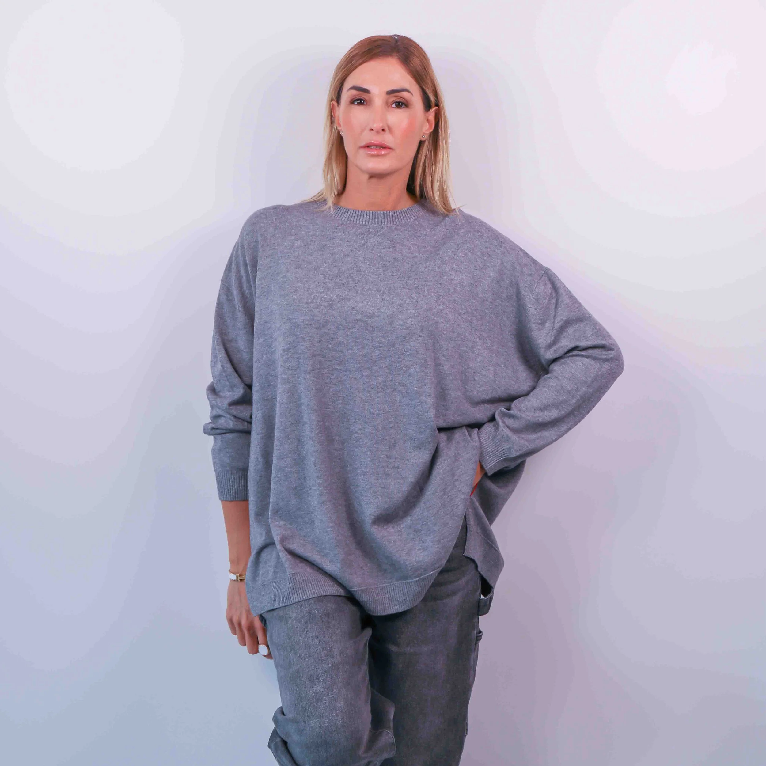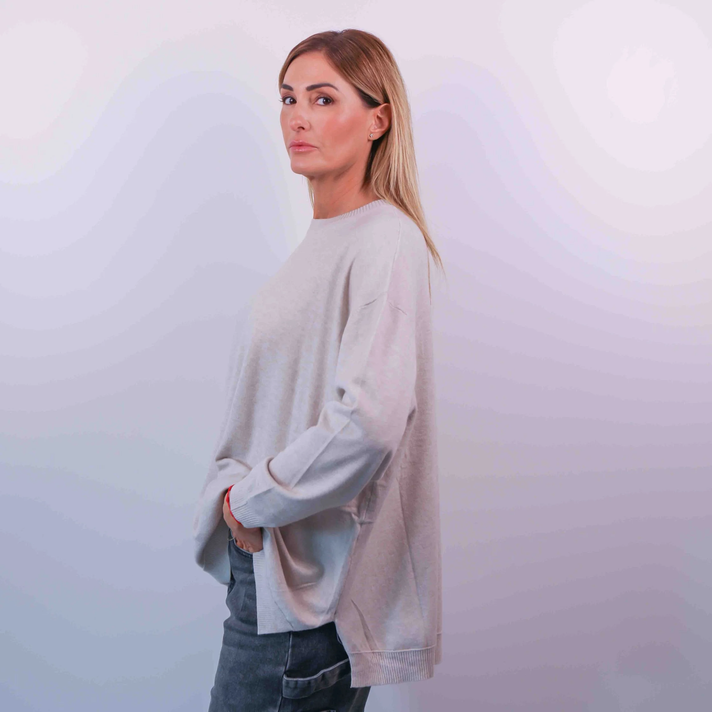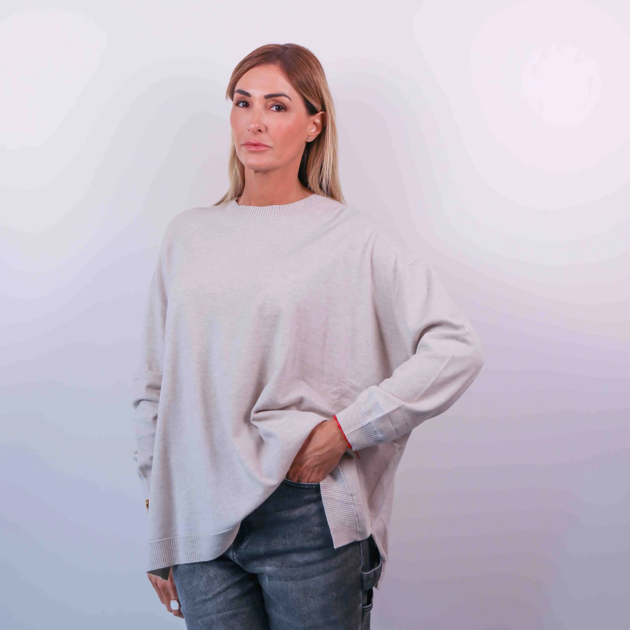 Il fit è morbido e leggermente oversize, con spalle scese e polsini elasticizzati per garantire comfort e libertà di movimento.