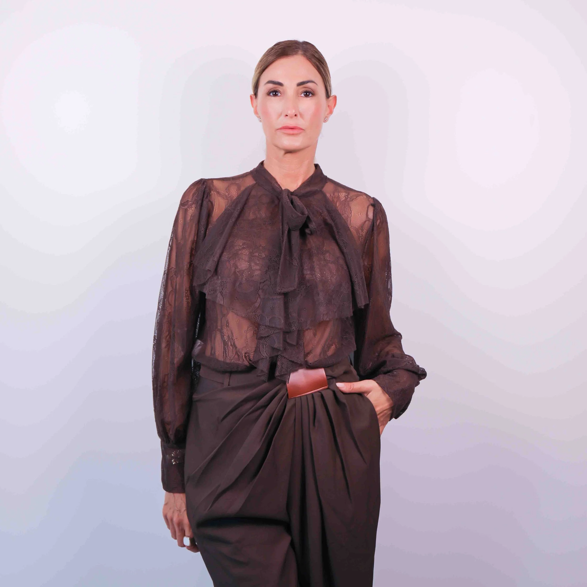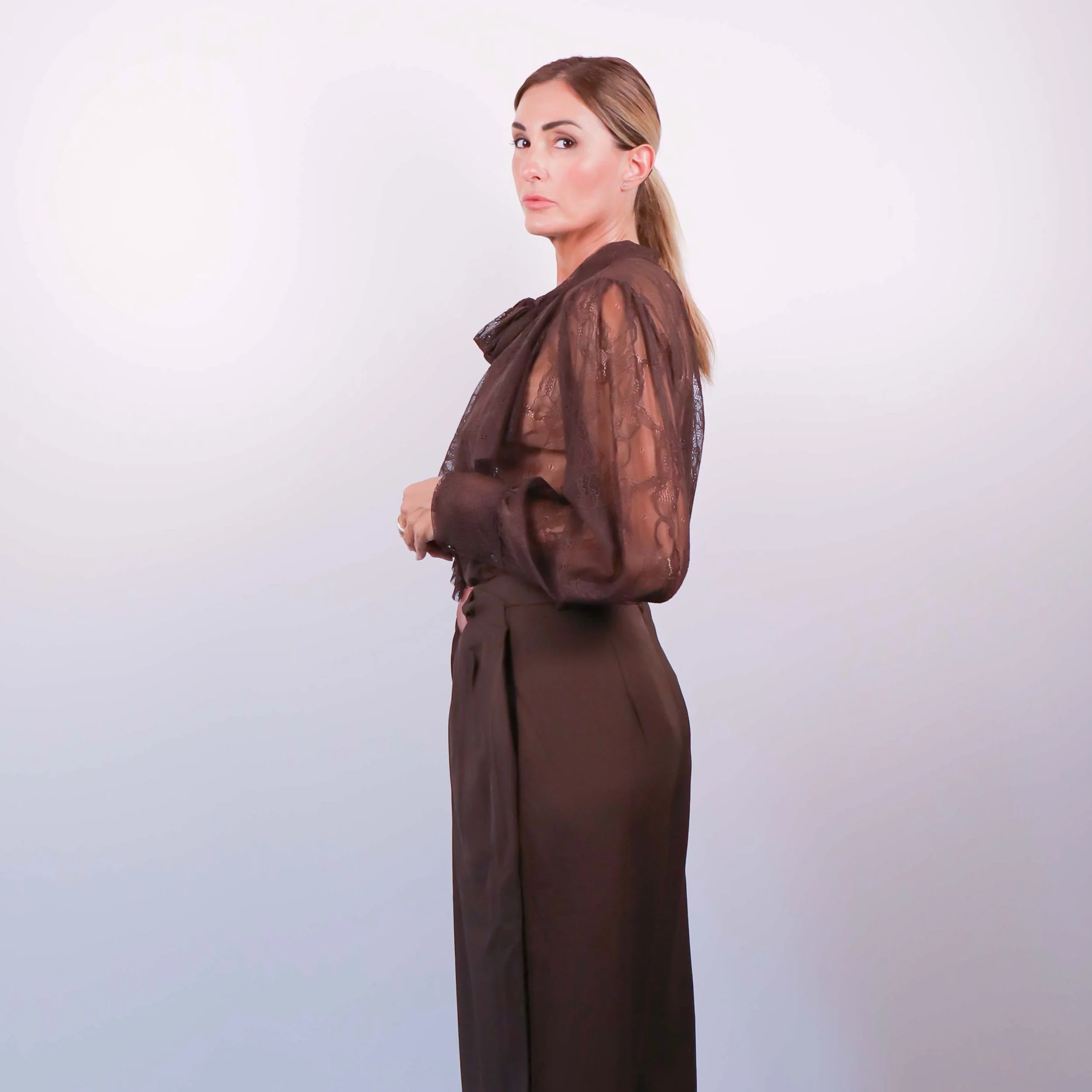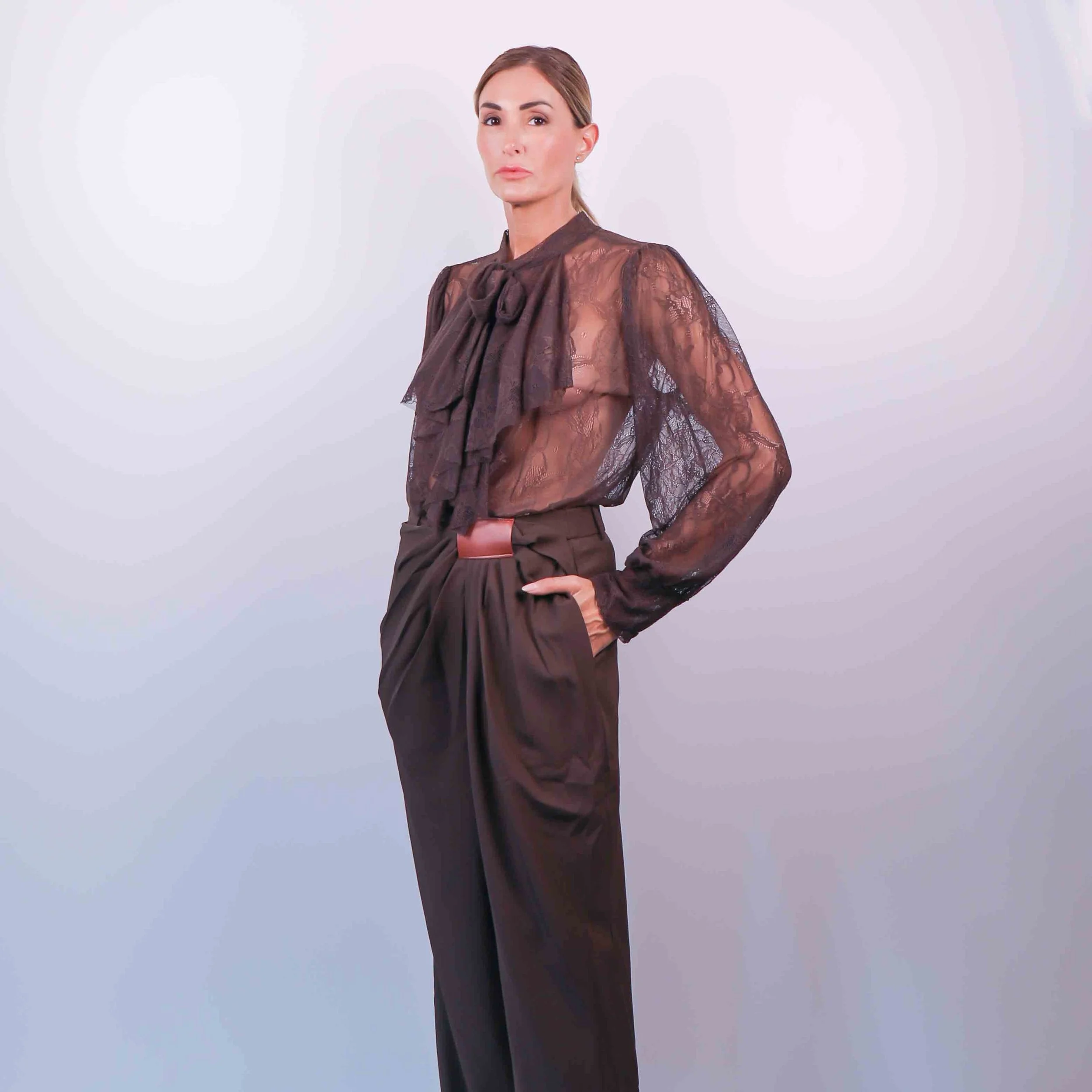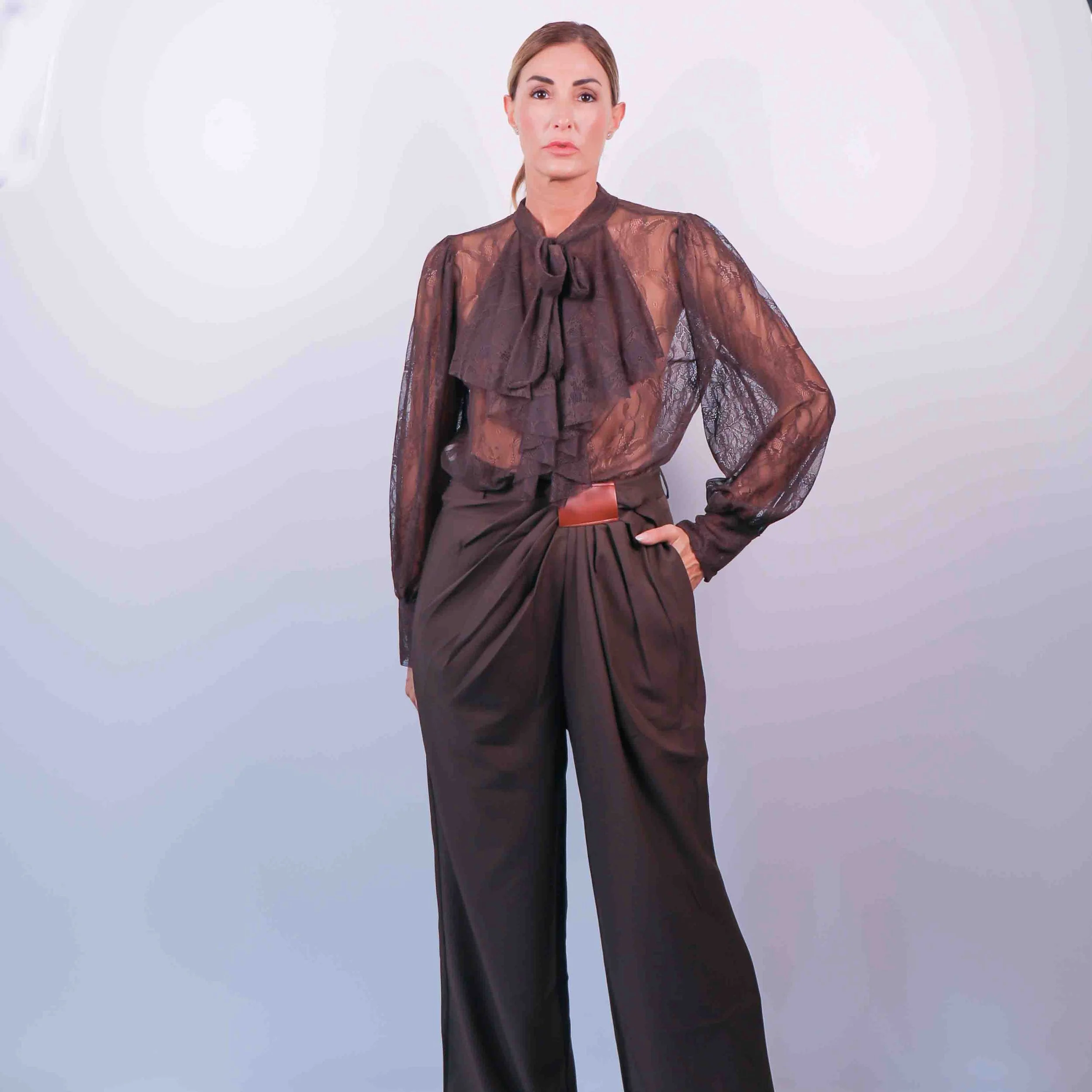 Un pantalone dallo stile sofisticato che coniuga sartorialità e modernità. Il modello Draped Elegance si distingue per la vita alta impreziosita da un pannello drappeggiato che crea un raffinato gioco di pieghe sul davanti, fermato da un inserto in contrasto che funge da dettaglio distintivo. La gamba ampia e fluida dona movimento e comfort, rendendolo un capo versatile e chic.