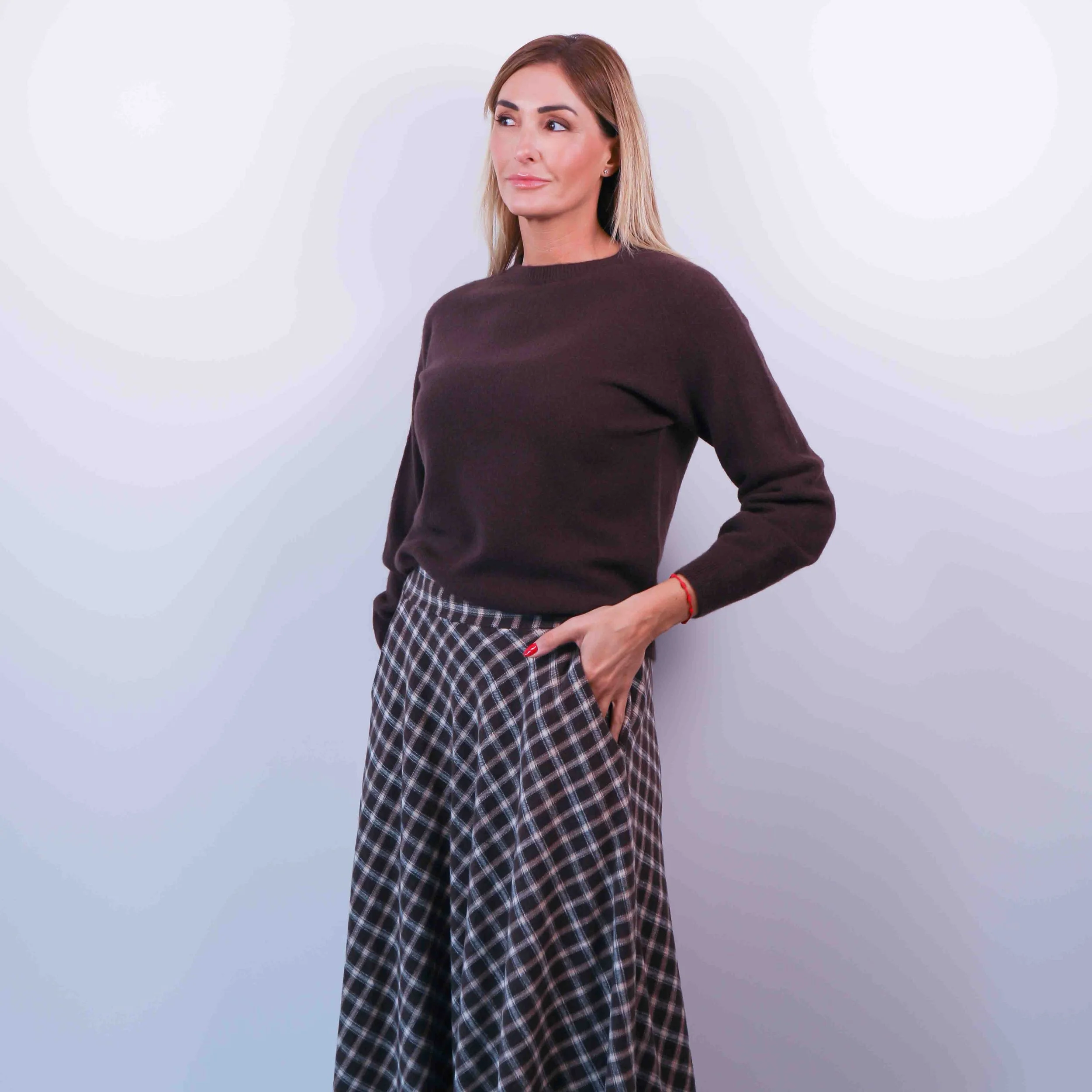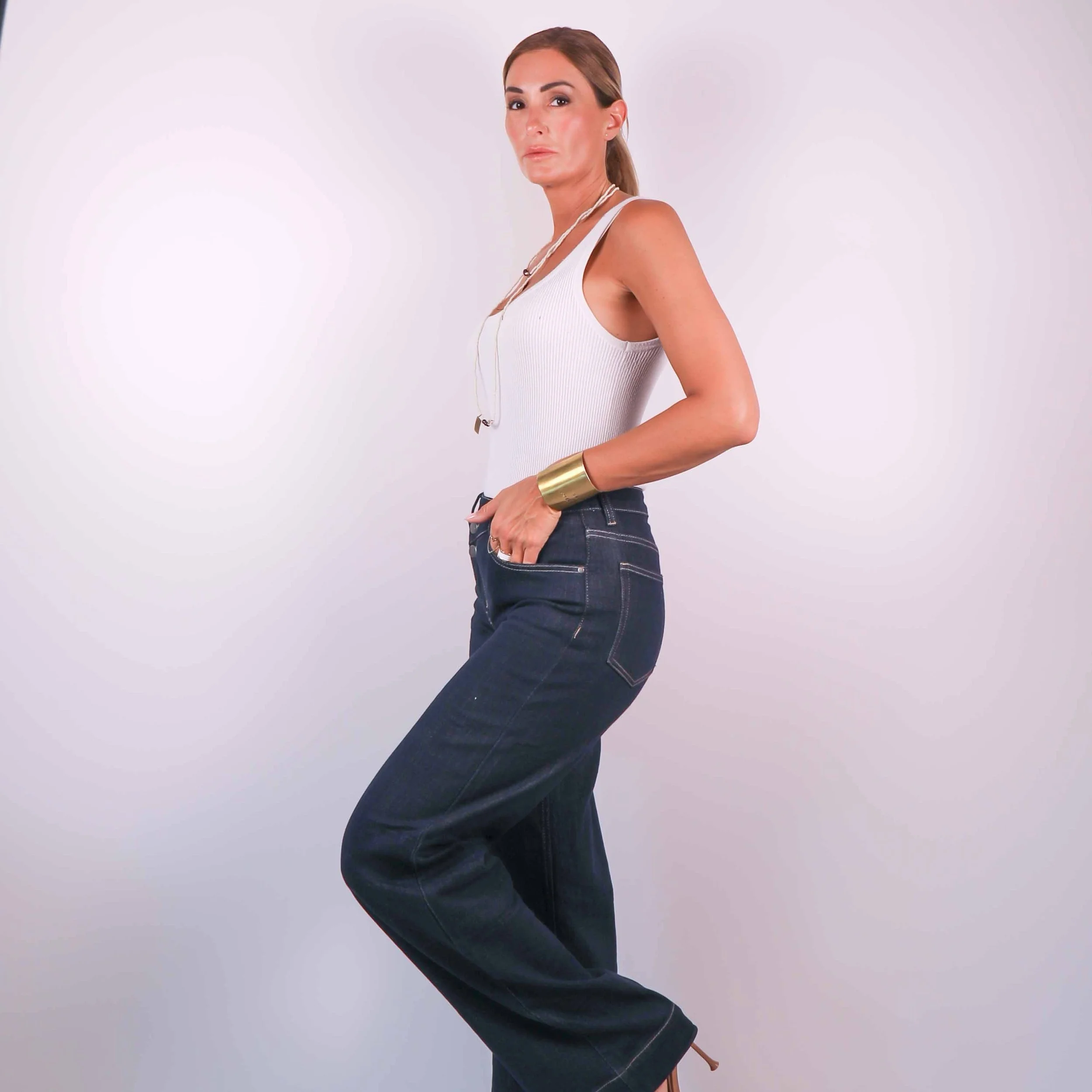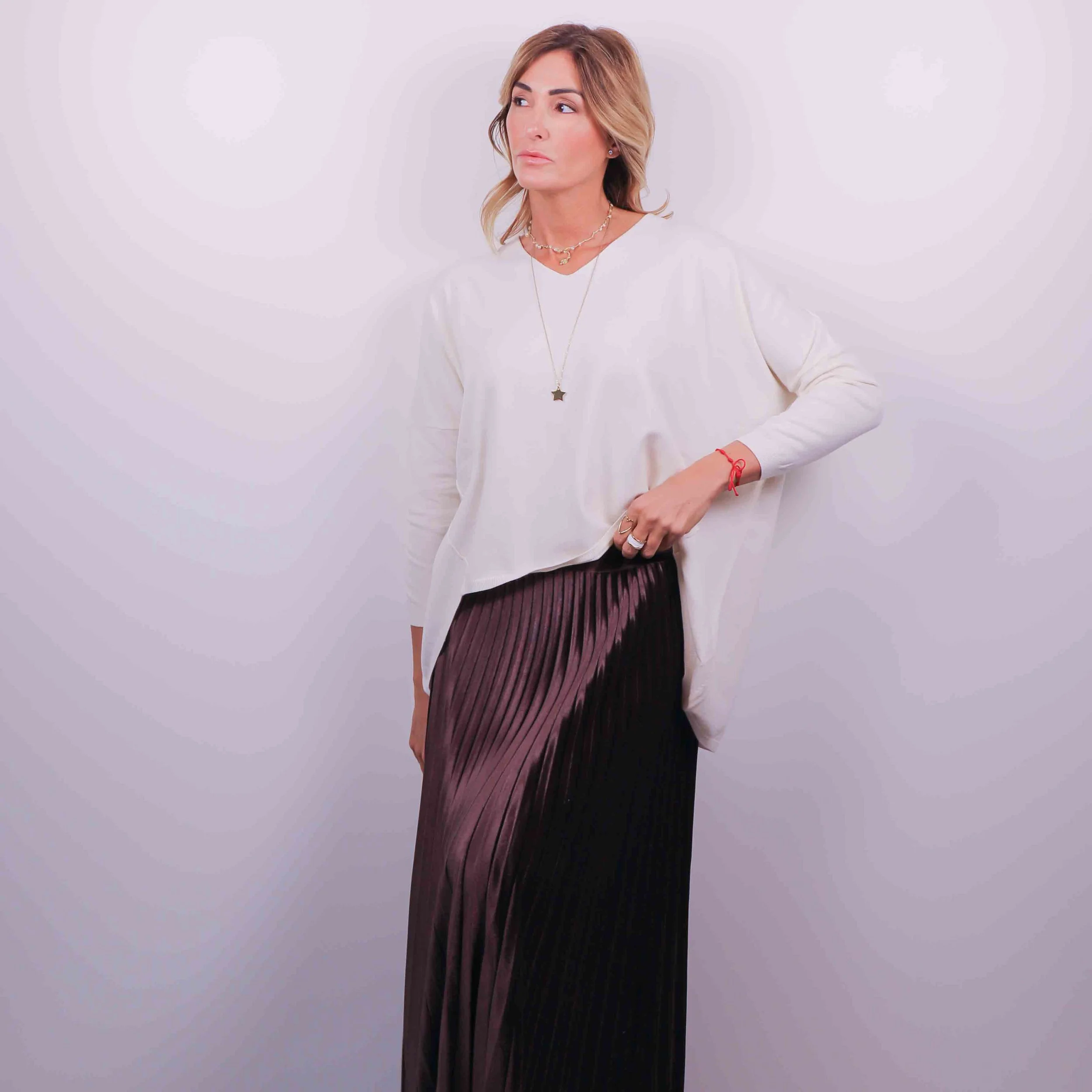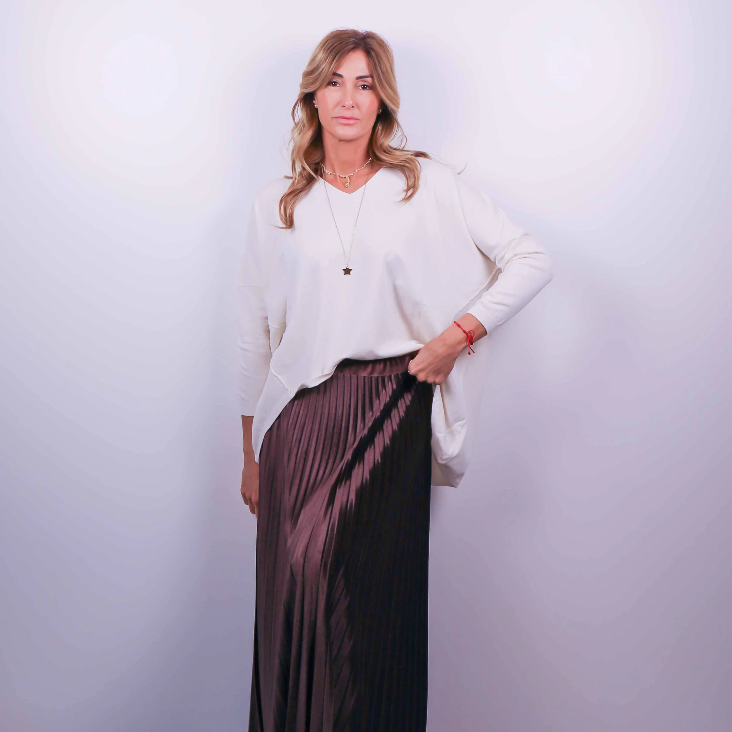 Un pantalone dallo stile sofisticato che coniuga sartorialità e modernità. Il modello Draped Elegance si distingue per la vita alta impreziosita da un pannello drappeggiato che crea un raffinato gioco di pieghe sul davanti, fermato da un inserto in contrasto che funge da dettaglio distintivo. La gamba ampia e fluida dona movimento e comfort, rendendolo un capo versatile e chic.
