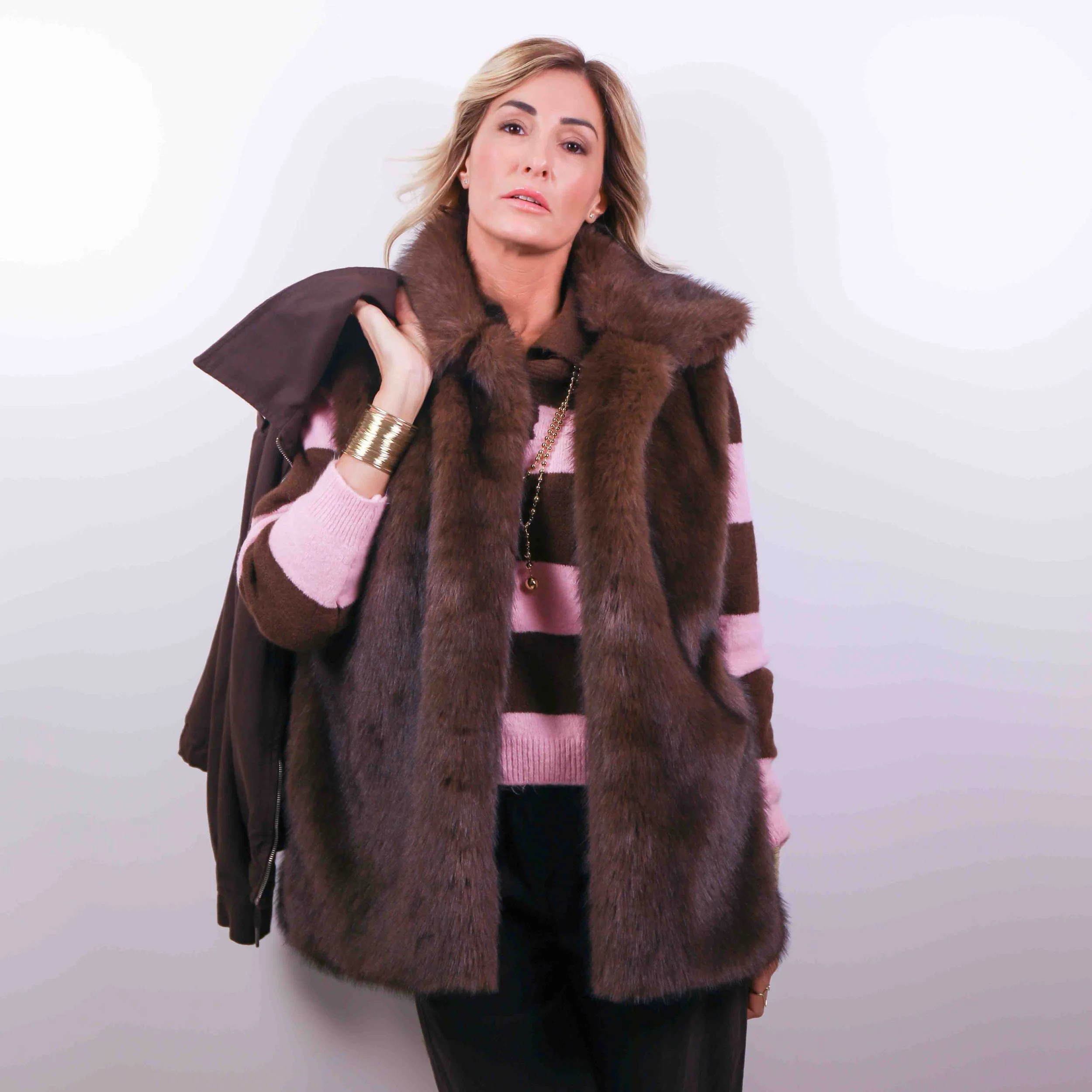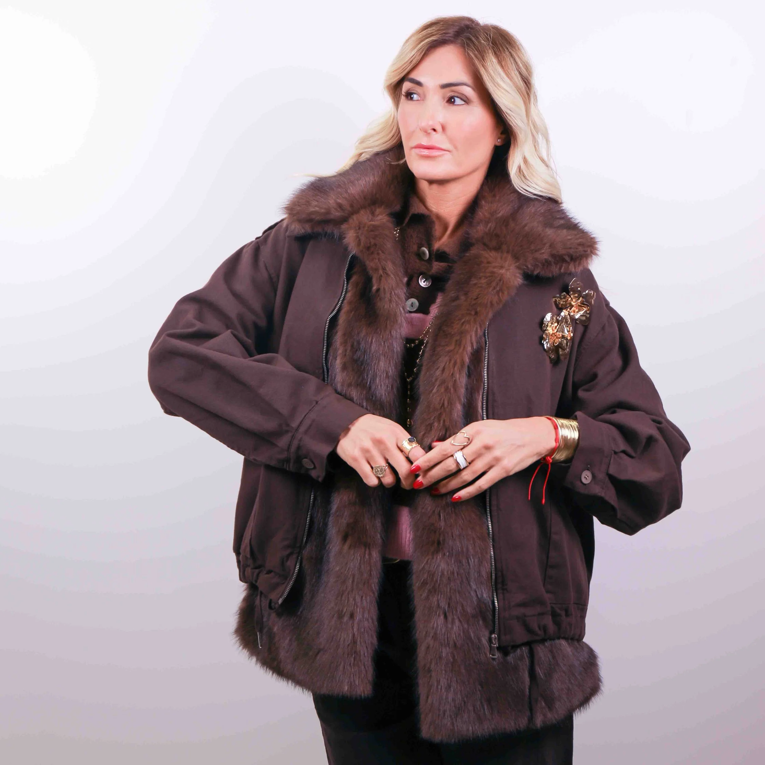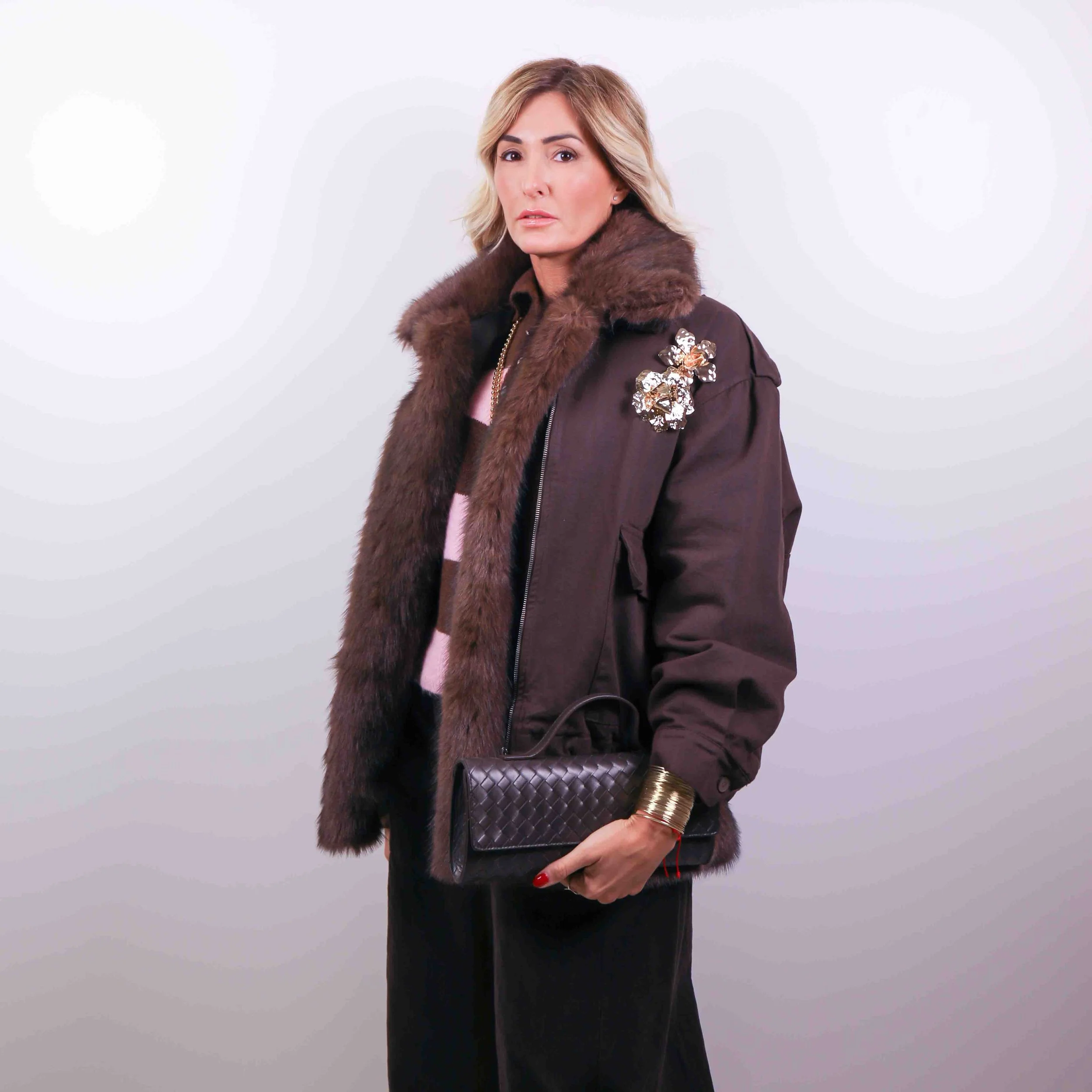 Tre giacche in una, in tessuto verde militare, impreziosita da un gilet in morbida ecopelliccia color cioccolato. Il design oversize dona un’allure sofisticata ma rilassata, mentre l’applicazione gioiello sul petto regala un accento di luce e femminilità.